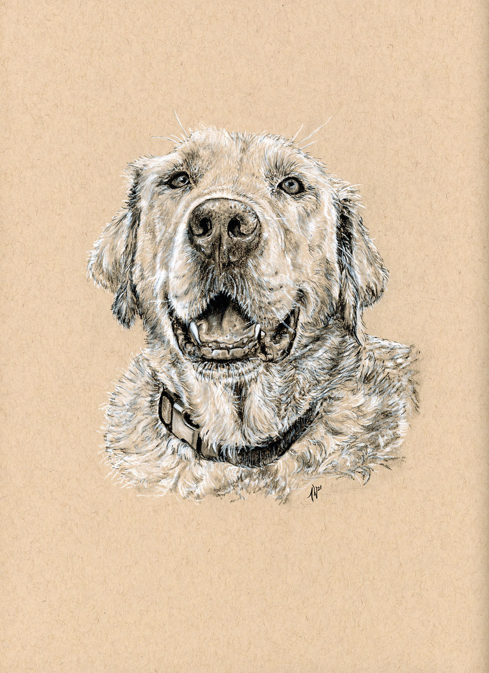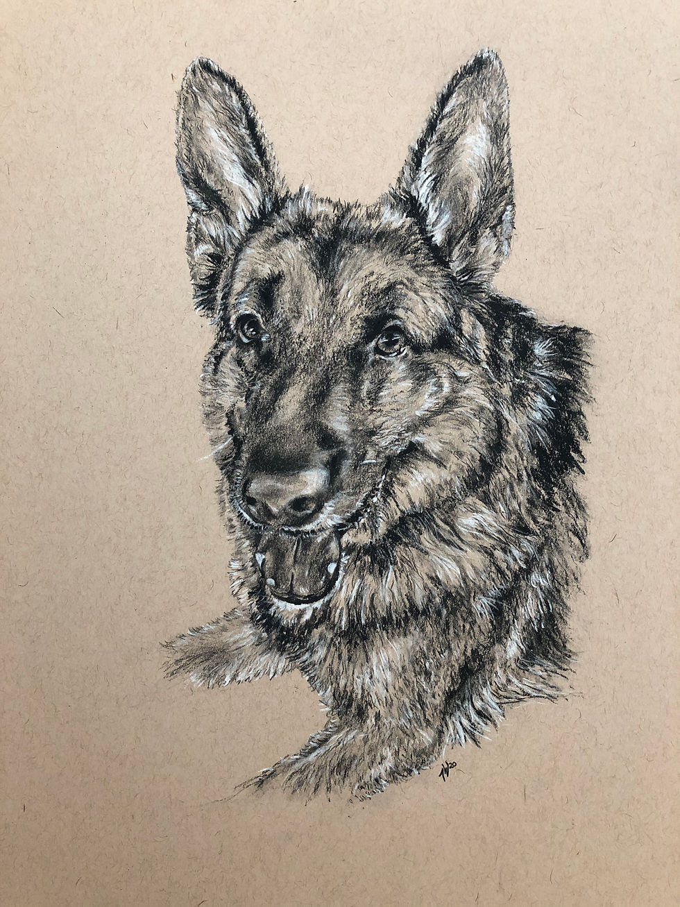 I love drawing animal portraits in charcoal and white chalk on a tan toned background because the fur looks so realistic!